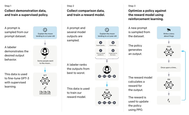 如下图所示,ChatGPT 在技术报告中将对齐分成三个阶段,后面两个阶段训练 RM 和 PPO 训练, 即 RLHF。