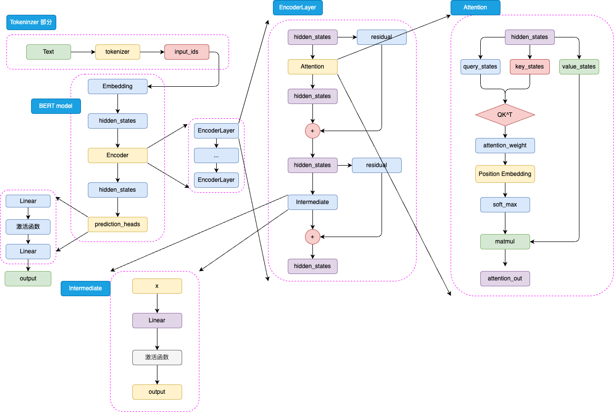 Encoder: N 层 Encoder Layer 堆叠,将 Embedding 层映射的 hidden_states 喂入 attention 机制,然后通过残差连接和原输入相加,再经过一层 Intermediate 层得到最终输出。